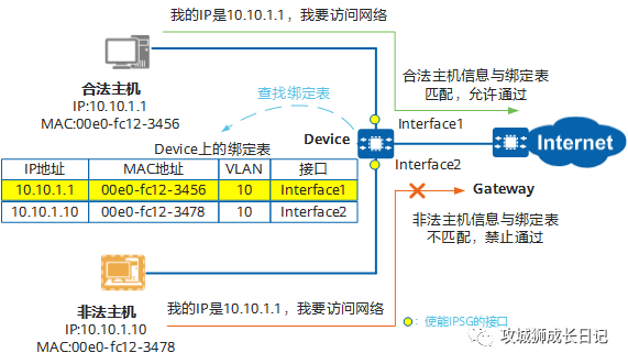 IPSG利用绑定表(源IP地址、源MAC地址、所属VLAN、入接口的绑定关系)去匹配检查二层接口上收到的IP报文,只有匹配绑定表的报文才允许通过,其他报文将被丢弃。