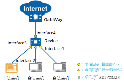 - Interface3接口为非信任接口但未使能IPSG功能,从Interface3接口收到的报文不会执行IPSG检查,可能存在攻击。