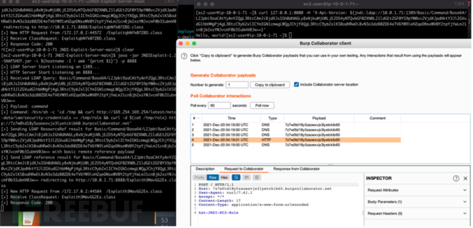 第二步:拿到角色名称之后,注入另一个JNDI Payload,并控制目标EC2查询内部元数据API以获取一个临时会话令牌,将令牌保存为文件之后,将文件的内容返回给攻击者控制的节点。