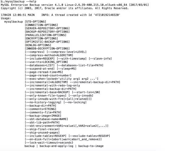 其实,在大多数情况下,单个文件备份,使用backup-to-image命令创建,性能优于backup。buckup这个命令只执行一个完整的备份过程的初始阶段。需要通过再次运行mysqlbackup运用apply-log 命令,使备份一致。