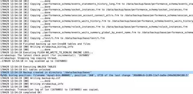 同样的,它也输出了当前的binlog filename和position,如果有gtid(同样也会输出) 可以用于搭建主从。最后一行一定会是你的lsn被copy的信息。 这是因为每次启动备份,都会记录170429 12:54:10 >> log scanned up to (1676085)),然后开始拷贝文件,一般来讲数据库越大拷贝文件是要花费越长的时间,所以说这期间一般情况都会有新的操作,所以说所有文件也可能记录的并不是一个时间点的数据, 为了解决数据这个问题,XtraBackup 就会启动一个后台进程来每秒1次的观测mysql的事务日志,直到备份结束。而且把事务日志中的改变记录下来。我们知道事物日志是会重用的(redo log),所以这个进程会把redolog写到自己的日志文件xtrabackup_log,这个后台监控进程会记录所有的事务日志的改变,用于保证数据一致性所。