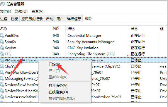 在服务种找到VMware NAT Service,并右键VMware NAT Service,点击开始: