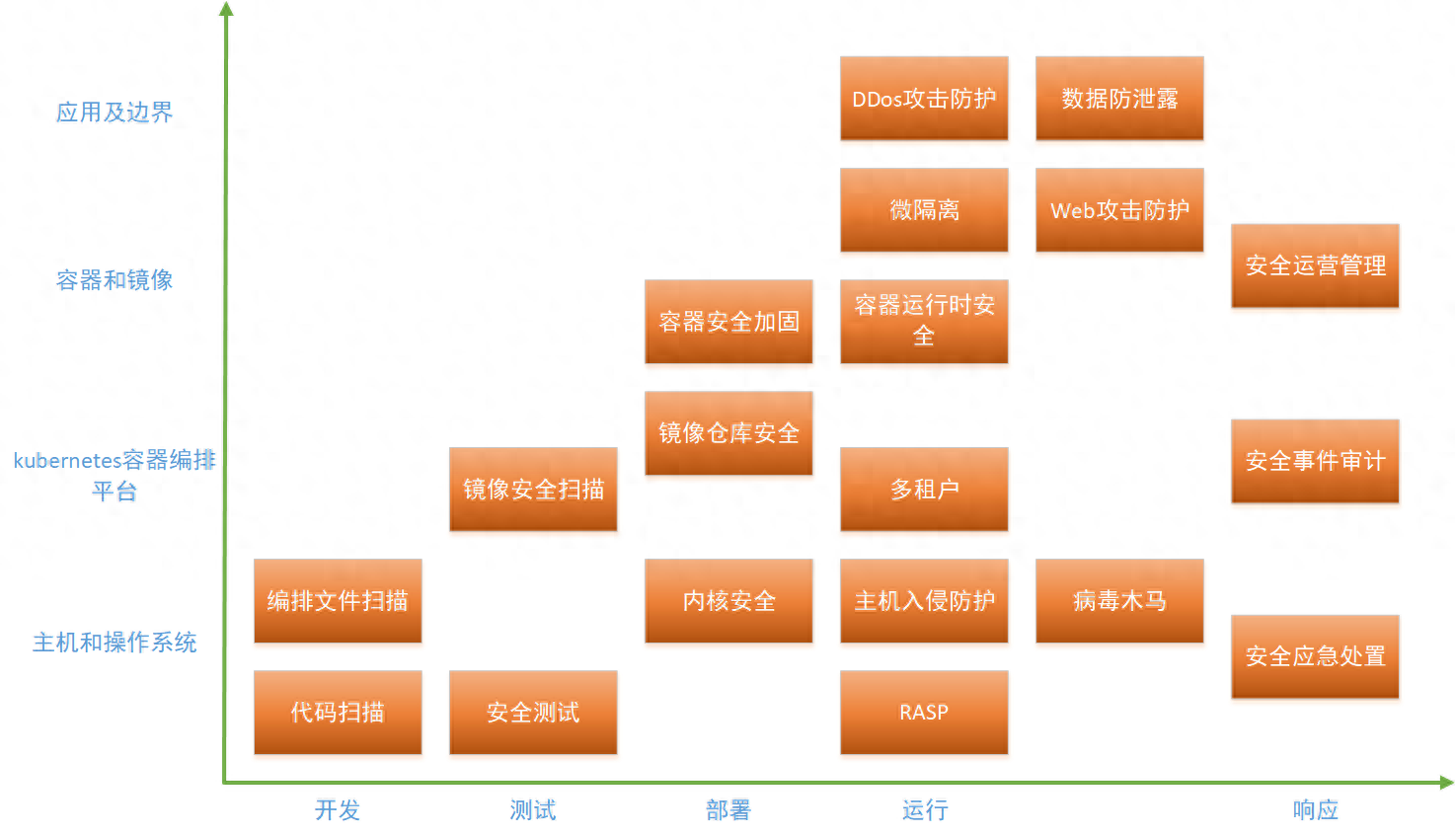 应用按照时间维度可分为开发、测试、部署、运行、响应,空间维度可分为主机、操作系统、kubernetes、容器、服务、网络,从这两个维度出发,将各种安全能力进行拆解和组合,通过统一的云原生安全平台进行管理,真正将安全和业务的各个阶段都能紧密地连接在一起,才能形成真正的云原生安全。