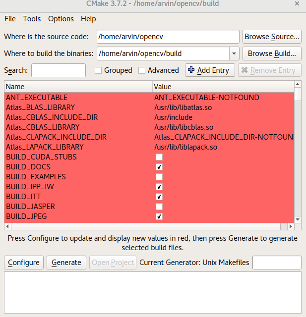- opencv_extra_modules_path 设为 opencv_contrib 中的 modules 目录的路径(比如,/home/arvin/opencv_contrib/modules)