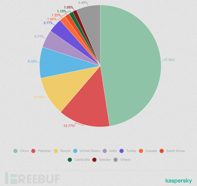 2023年上半年,卡巴斯基蜜罐登记的密码暴力破解尝试中有97.91%针对Telnet,只有2.09%针对SSH。执行这些攻击的受感染设备大多来自印度和美国,而巴基斯坦和俄罗斯则是攻击最活跃的国家。