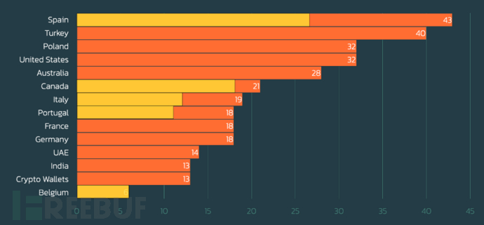 研究人员发现,2022 年,Xenomorph 特别关注西班牙、葡萄牙和意大利。但在今年3月的攻击中却又新增了多个国家。最新版本的Xenomorph几乎针对全球400家金融机构,主要分布在美国、西班牙、土耳其、波兰、澳大利亚、加拿大、意大利、葡萄牙、法国、德国、阿联酋和印度。