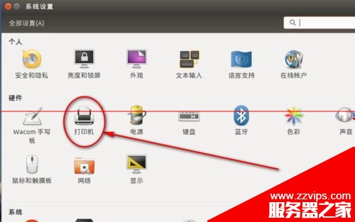 2、在 系统设置窗口中的“硬件”项目下面,找到“打印机”,并使用鼠标左键点开它。