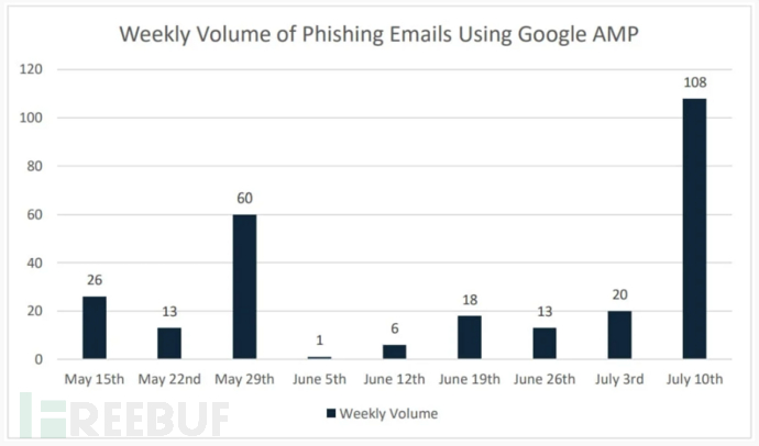 反钓鱼保护公司 Cofense 的数据显示,使用 AMP 的网络钓鱼攻击数量在 7 月中旬大幅飙升,这表明威胁行为者可能正在采用这种方法进行一些行动。