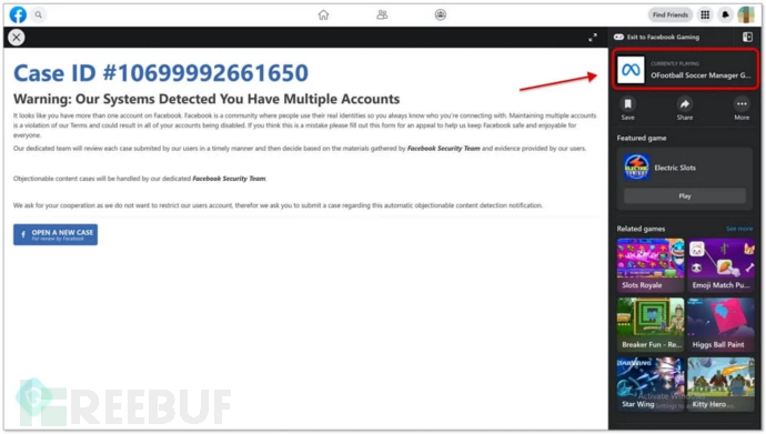 托管在 Facebook 游戏平台上的网络钓鱼页面(Guardio Labs)