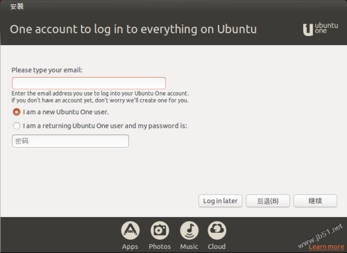 下面登陆Ubuntu账户,愿意的填email创建一个,我选择以后登陆,估计很久很久以后=。=