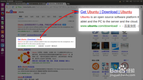 在百度中搜索 Ubuntu,在结果中查找网址包含 www.ubuntu.com 的结果。