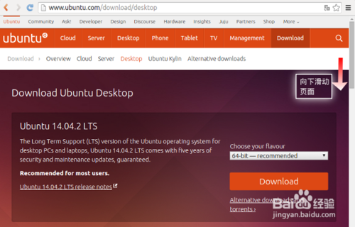 页面首先呈现给我们的是 Ubuntu 14.04.2 LTS 的下载选择。这是因为Ubuntu 14.04 是长期支持版本,并且仍然处在支持周期之内。
