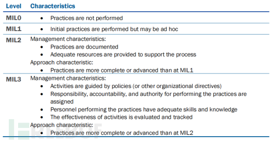 • MIL在每个域内是累积的。要在实施指定的级别,组织必须执行该级别及其以下级别的所有实践。