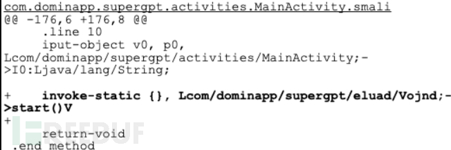 比较恶意应用程序与合法应用程序之间的差异,很明显可以发现恶意代码为以下 Smali 代码的部分: