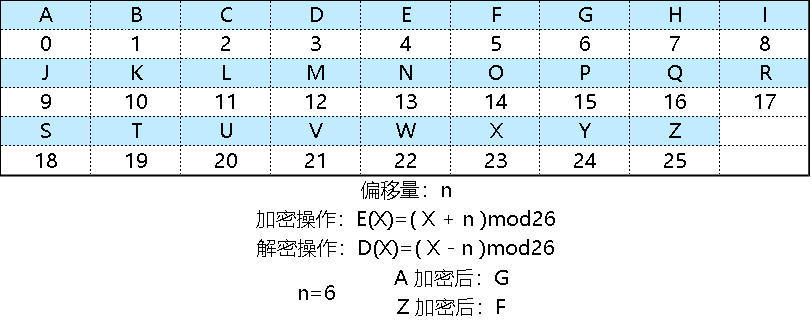 恺撒密码是一种最简单且最为人知的加密技术。消息上的所有字母,都是通过在如下的单个字母表上向后(或者向前)按照一固定数目进行偏移(即偏移量n)后,实现“加密”。同样,利用偏移量这个解密密钥,我们就可以对密文解密。