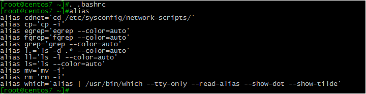 例如:我们经常用的一个文件,cd /etc/sysconfig/network-scripts/ 这个命令就特别长,如果每次要进入这个文件都要输这么长,是不是很浪费时间?那么我们可以给它定义一个别名,比如cdnet(当然这个你可以自己选择认为好记得),当然我们可以先检查一下“cdnet”这个别名或者命令有没有重复,我们定义的别名最好不要跟系统已经定义的别名和系统的一些命令起冲突,我们可以输入你要设置的名称,现在我要设置cdnet,你可以输入cdnet然后回车,看下有没有这个命令,提示说找不到这个命令,那么你就可以使用cdnet来定义这个别名,当然我们也可以输入命令“alias”,就可以看到我们已经定义了哪些别名,以后我们添加的永久别名,也会保存在这个里面。现在我们提示没有cdnet这个命令或者别名,我们就可以使用这个用alias cdnet=‘cd /etc/sysconfig/network-scripts/'来给它建立别名,然后你在输入cdnet,跟你输入cd /etc/sysconfig/network-scripts/是完全相同的命令,这样是不是方便多了?