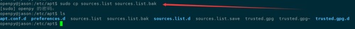 3、备份此目录下的source.list文件(要有sudo权限), 此时就有了一个source.list.bak文件