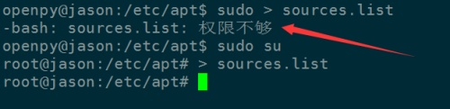 4、清空source.list文件内容(注: 清空后不可恢复, 所以需要执行上一步提前备份一下这个文件), 此时用sudo提示权限不够, 直接切换到root用户下执行这条命令