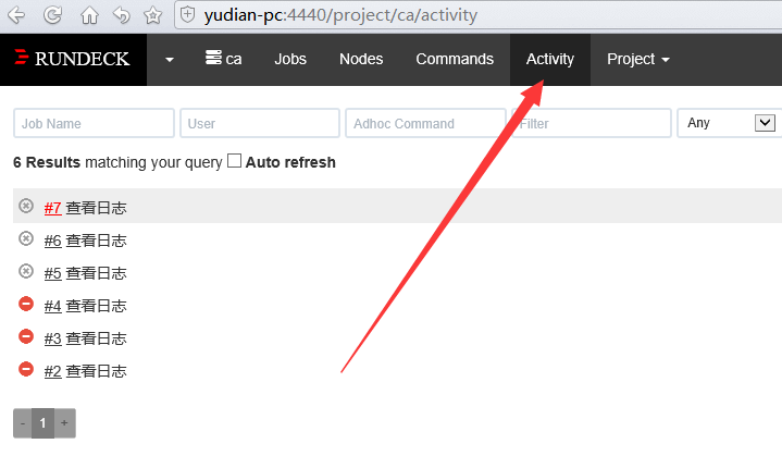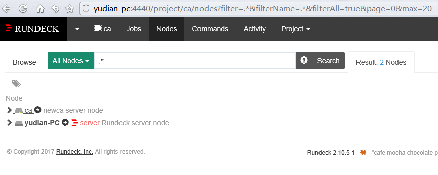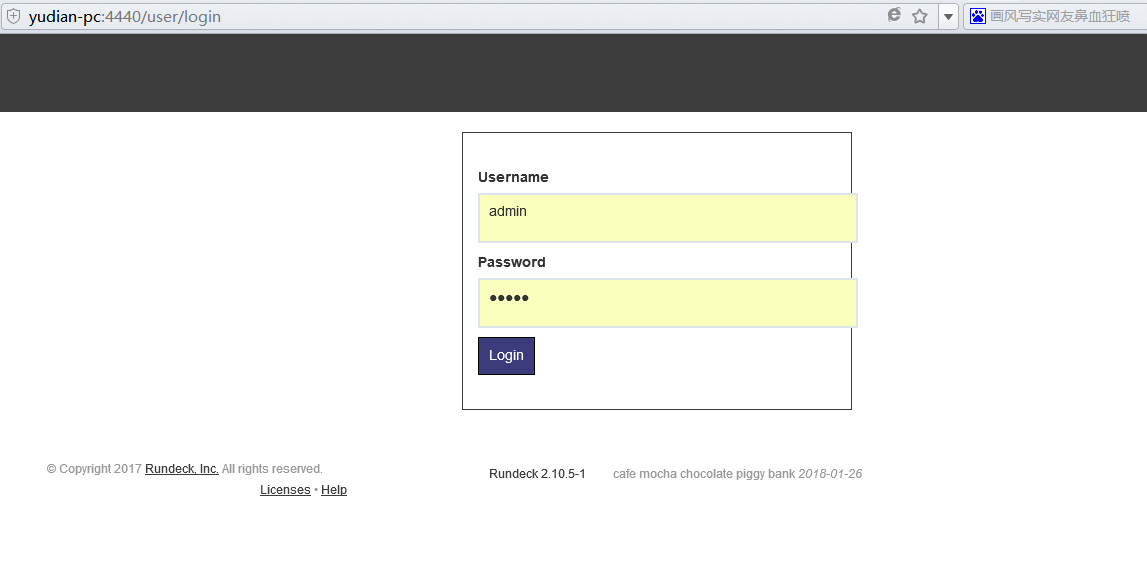 ps:注意我截图的地址,yudian-pc:4440,是因为RunDeck启动的时候默认获取了计算机名称设置了framework.server.hostname = yudian-PC,这会导致虽然我们用localhost可以访问到服务,但是提交表单跳转的时候,都会被定向到yudian-pc:4440。解决方法如下: