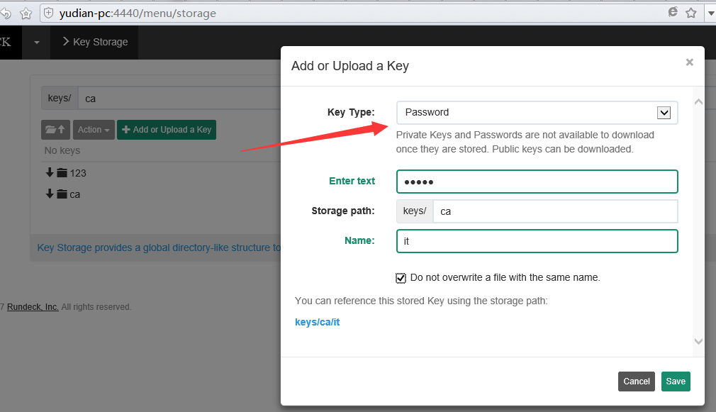 入口从,右上角用户标志的左边那个配置按钮key storage进入,注意的我的url为http://yudian-pc:4440/menu/storage。创建好后在项目ssh属性password中选中创建好的key
