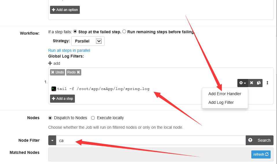 新增一个可执行的job,添加tail -f xxx.log用来查看远程服务器输出的日志信息,操作如下,注意如下箭头标注,可以指定筛选到的服务器,这里是ca,也可以配置命令执行失败后的处理流程等等。