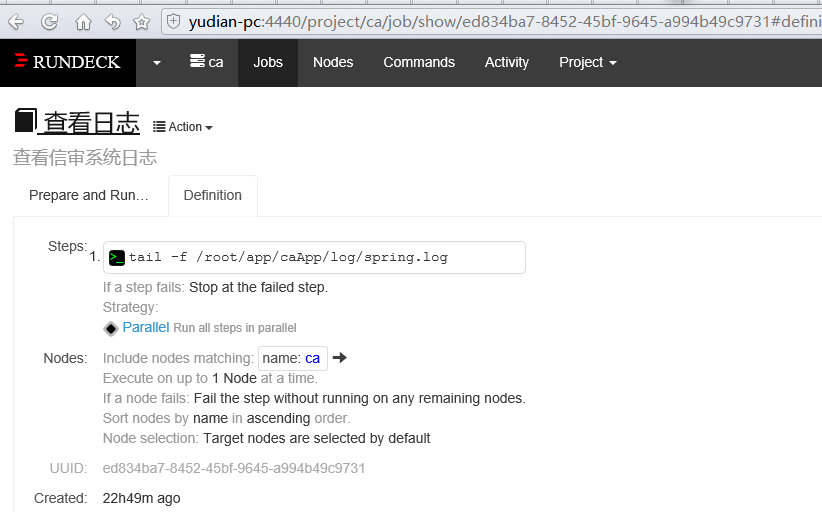 (4)新增job,添加查看日志的命令,在ca节点执行