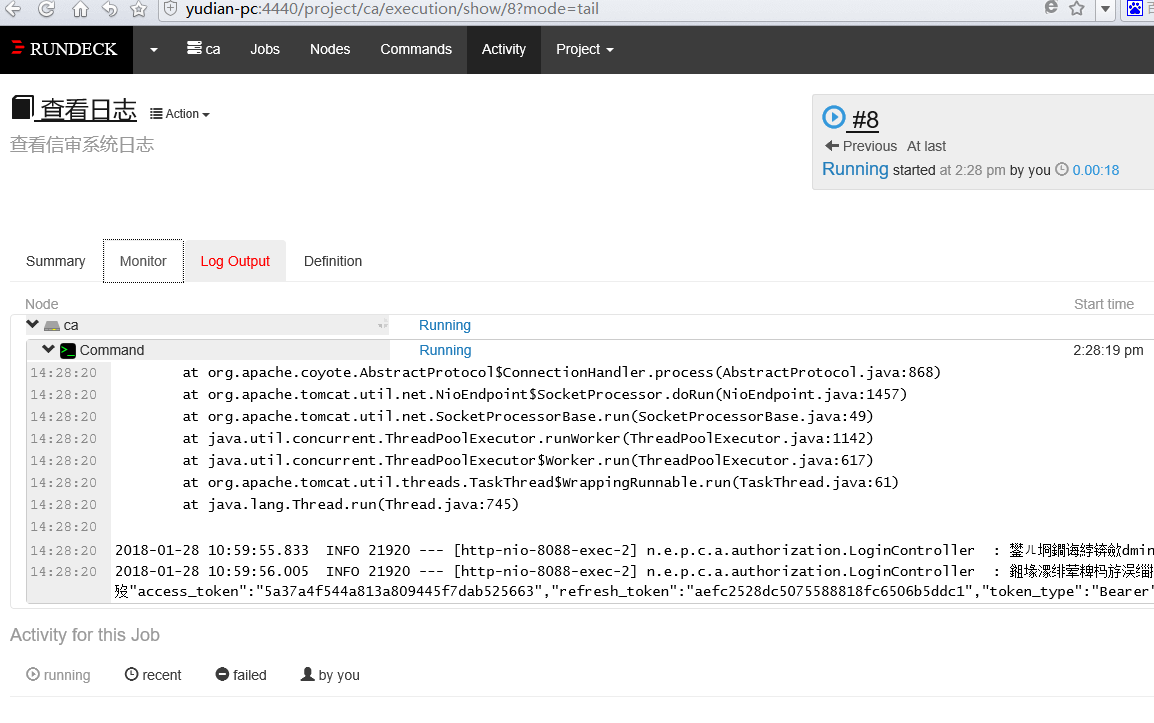执行job后,会不断地输出目标节点服务器的日志信息,如
