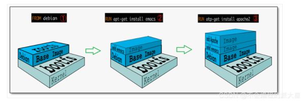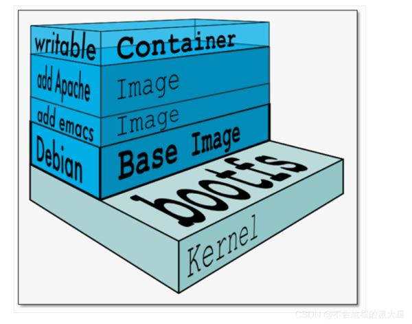 从上图可以看到,新镜像是从 base 镜像一层一层叠加生成的。每安装一个软件,就在现有镜像的基础上增加一层。
