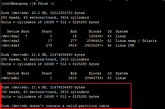2、为该系统添加一块新的虚拟硬盘,添加后需重启虚拟机,否则系统不识别;如下图,/dev/sdc 是新添加的硬盘;