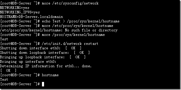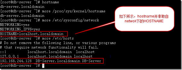 不是hostname的配置文件,难道还另有其它配置文件?于是我当时实验了一下修改了/etc/sysconfig/network文件中HOSTNAME为DB-Server,发现hostname的值依然没有变化,于是重启了计算机