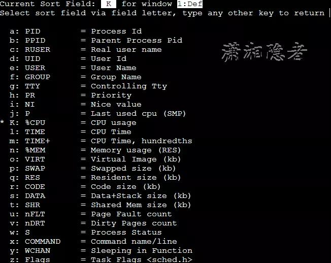 执行top命令后,执行SHIFT +F ,可以选择按某列排序,例如选择n后,就会按字段%MEM排序