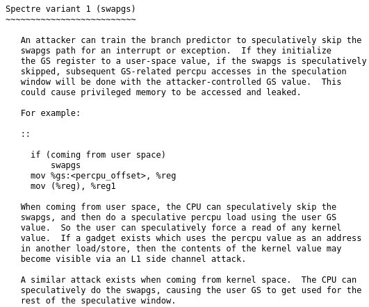 去年 Spectre V1 漏洞相关的 Linux 内核提交导致 SWAPGS 处理部分比较混乱:Spectre V1 SWAPGS 漏洞缓解方案在路径中丢失了防护 。因此,赖江山的第一个补丁就是在paranoid_entry() 中为内核的 SWAPGS 条目添加了防护:FENCE_SWAPGS_{KERNEL|USER}_ENTRY,以保证 SWAPGS 和 CR3 写入的顺序,可以在内核邮件中查看此补丁的详细信息。