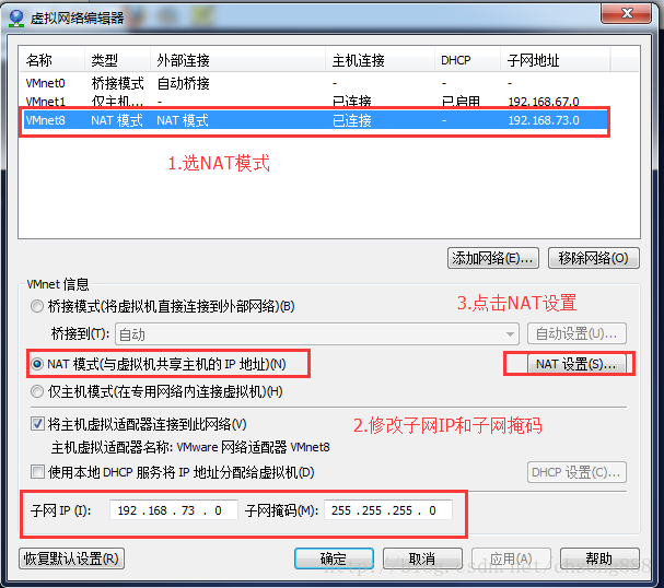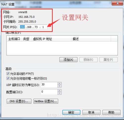 一、在菜单栏选择编辑→ 虚拟网络编辑器,打开虚拟网络编辑器对话框,选择Net网络连接方式,随意设置子网IP,点击NAT设置页面,查看子网掩码和网关,后面修改静态IP会用到。