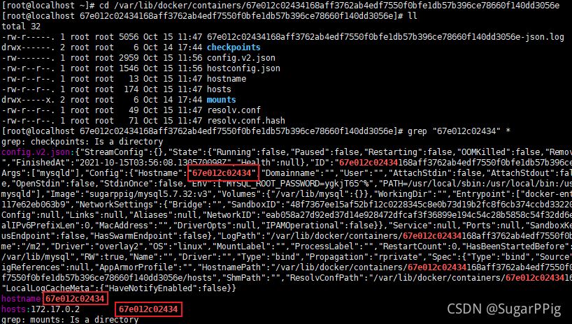 3、进入该容器所在配置文件所在宿主机文件夹,搜索原 hostname,可以看到我们需要修改3个地方,文件分别是 config.v2.json、hostname、hosts