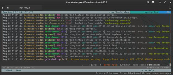 一旦安装,你可以简单地用管理员权限从终端运行lnav,它将默认显示/var/log中的所有日志并开始实时监控。