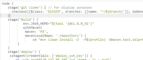 stage是描述此Pipeline阶段的语法块 。stage在Pipeline语法页面上阅读关于声明式管道语法块的更多信息。如所提到的上述,stage块在脚本管道语法可选的。