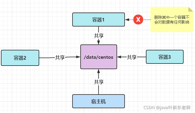 容器和容器之间实现数据共享之后,就没有主容器和子容器之分了,因为它们共享的数据只有一份,是保存在宿主机上面的,删除任何一个容器,都不会影响其他容器的数据同步;