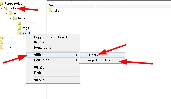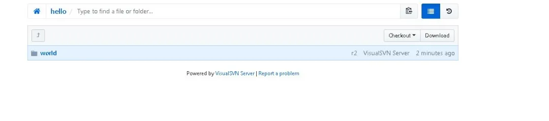 经过这一番操作,即可添加文件夹,不过需要注意的是,此时的hello这个仓库中能看到的子文件夹在本地磁盘中的仓库目录中并没有,也就是说我们是无法自行在这个文件夹下添加文件的,即使添加了,visualsvn也不承认这是属于它的一部分,所以这个时候需要我们使用集中版本控制系统的客户端来进行代码文件的上传了。