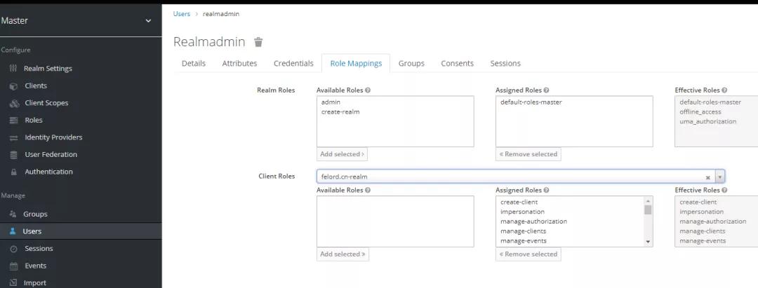 我们在Master Realm中建立一个用户,并在其角色映射中剥夺admin和create-realm角色,同时在Client Roles中选中felord.cn-realm 把该客户端的所有角色都赋予建立的用户。例如: