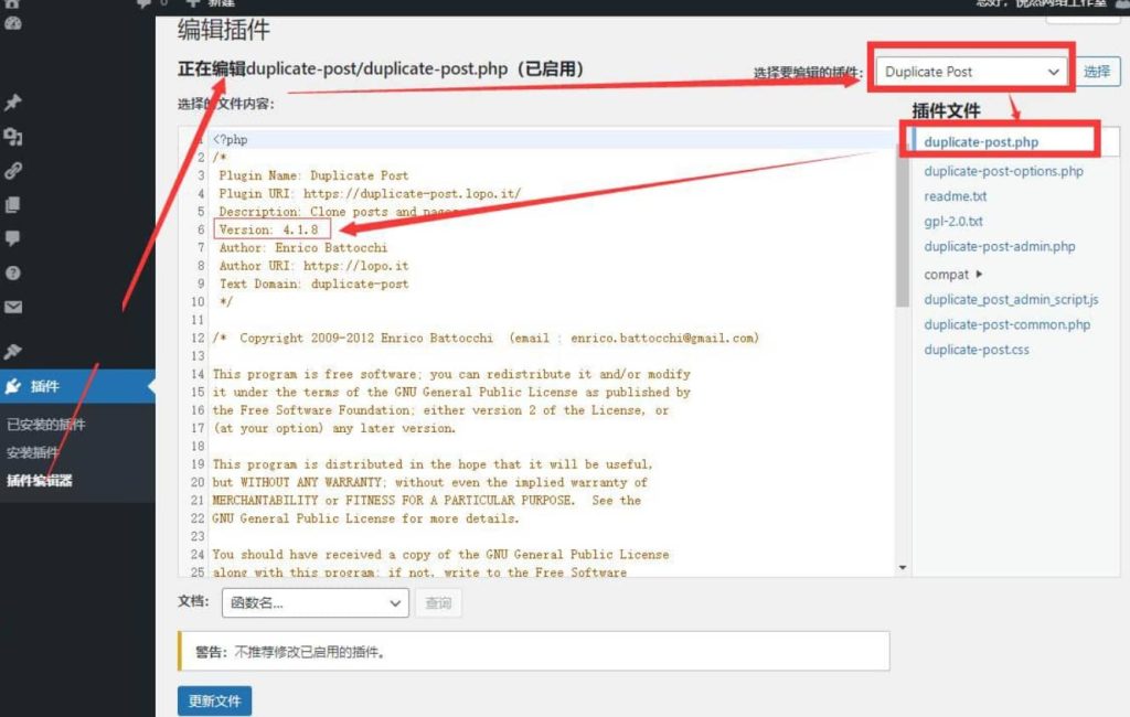 那么只需进入WordPress建站后台,打开【插件】-【插件编辑器】,然后 页面右侧选择要修改的插件,然后进入对应的文件修改版本号即可。选择【Duplicate Post】这个插件之后在中间的代码窗口中找到【Version】,修改后面的数字(也就是版本号)就可以了,可以改成是新版本,也可以改成更高版本,然后点底部的【更新文件】按钮。