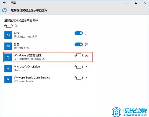 4、在弹出的“选择在任务栏上显示这些图标”窗口中寻找“Windows 資源管理器”,将开始设置为“关”就可以。