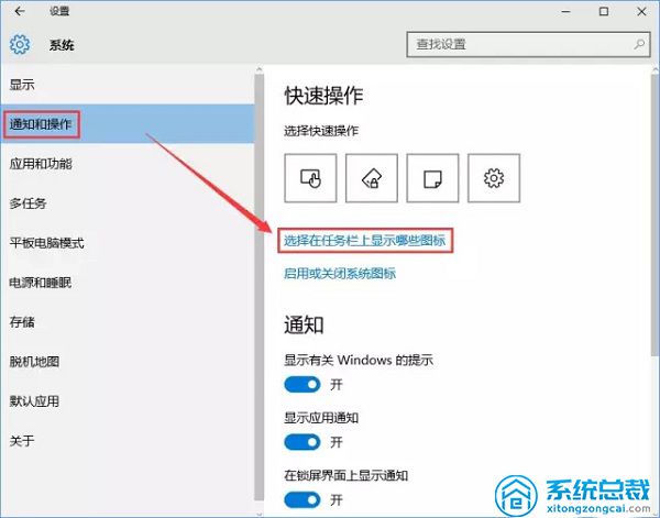 3、在“系统”界面左边点一下“通告和操作”,在右边点一下“选择在任务栏上显示什么图标”;