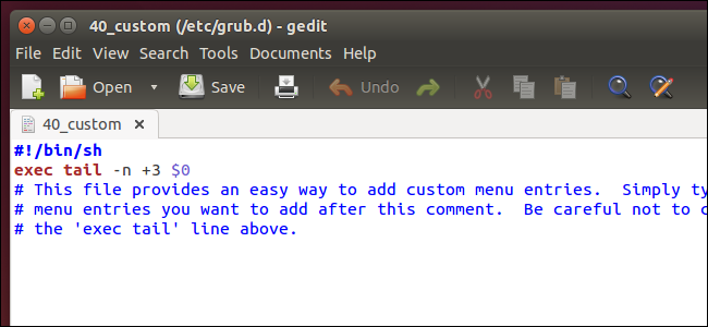 除非你已经添加了其它自定义启动条目,否则你应当看到的是一个几乎空的文件。你需要在注释行下添加一个或多个ISO启动部分。
