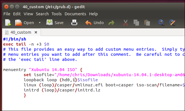 menuentry "Ubuntu 14.04 ISO" {set isofile="/home/name/Downloads/ubuntu-14.04.1-desktop-amd64.iso"loopback loop (hd0,1)$isofilelinux (loop)/casper/vmlinuz.efi boot=casper iso-scan/filename=${isofile} quiet splashinitrd (loop)/casper/initrd.lz}