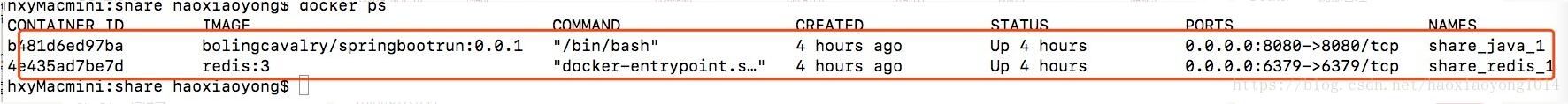 将上面的内容写到docker-compose.yml之后,在此文件所在目录执行命令docker-compose up -d,即可启动两个容器,再执行docker ps可以看到容器信息如下: