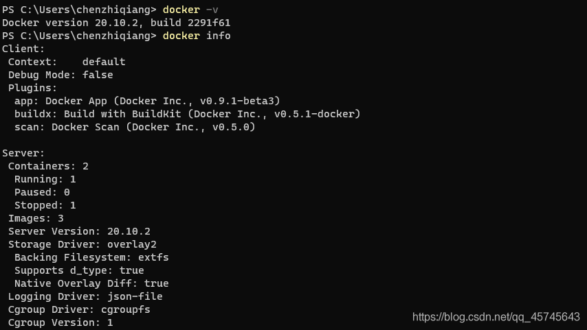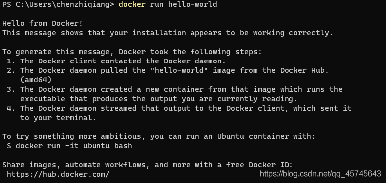 打开命令行工具输入下面命令检验docker是否安装成功: