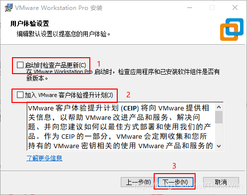 6.先取消“启动时检查…”和“加入vmware…”前面的勾选,然后点击【下一步】