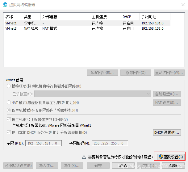这里我们使用nat(网络地址转换模式),打开vmware,点击“编辑”下的“虚拟网络编辑器”,点击更改设置