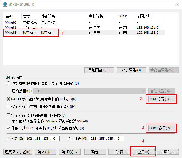 设置虚拟机中nat模式的选项,设置nat参数及dhcp参数。