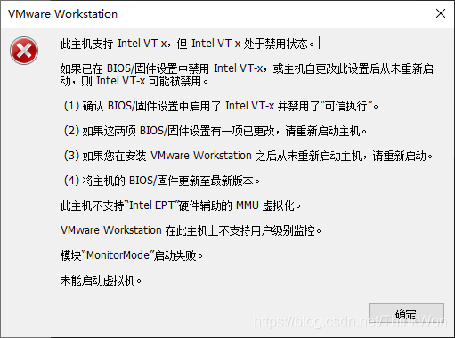 2.如果报错此主机支持intel vt-x,但intel vt-x处于禁用状态